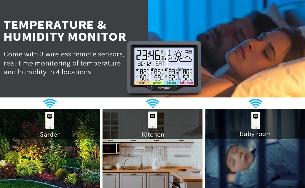 WEATHER STATION WITH 3 OUTDOOR SENSOR: Distribute 3 remotes within 200 feet of your indoor weather station, such as kitchen, bedroom, yard, greenhouse, etc. It will be very easy for you to monitor the temperature and humidity inside and outside from 4 different locations.