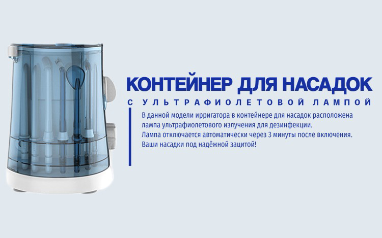 Nicefeel FC-288 | Устройство значительно увеличивает степень гигиенической защиты ротовой полости. В комплект насадок входят: стандартная, ортопедическая, пародонтальная, для очистки имплантатов, мостов, языка. Для хранения насадок имеется специальный отсек в корпусе. Цена 2 624 р. |