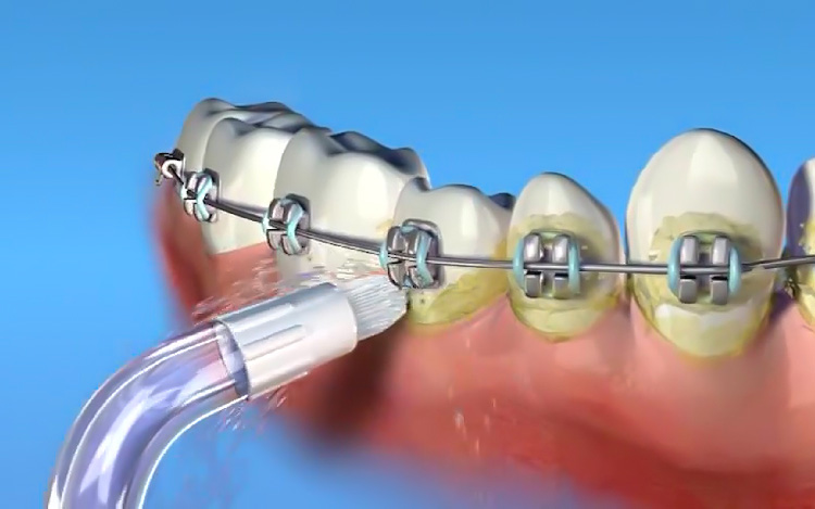 - Направить струю воды под углом 60-90 градусов к зубам.
