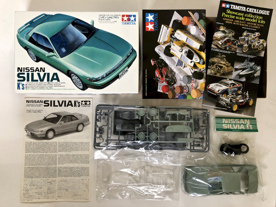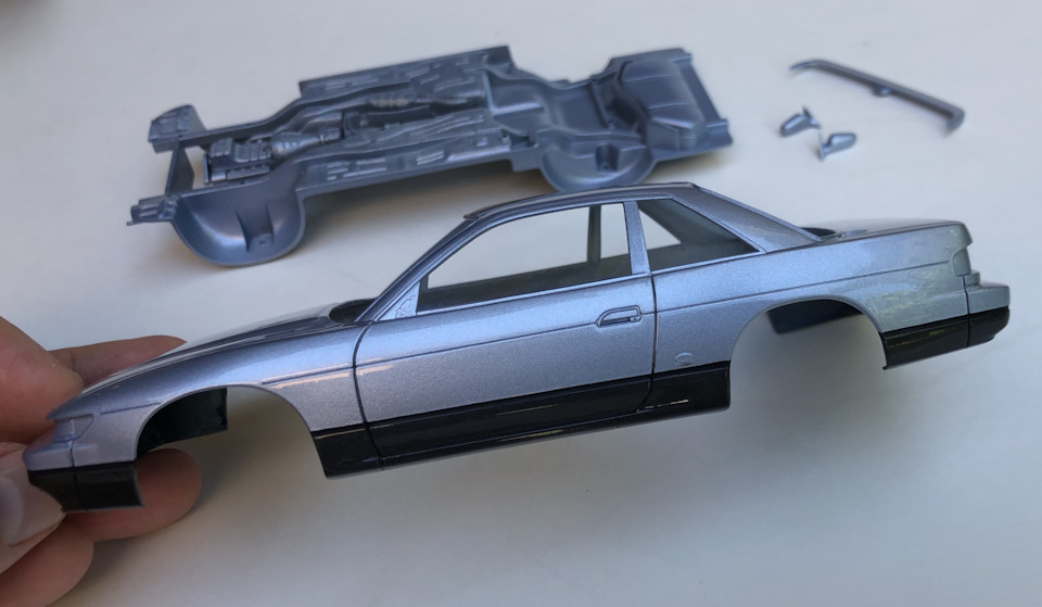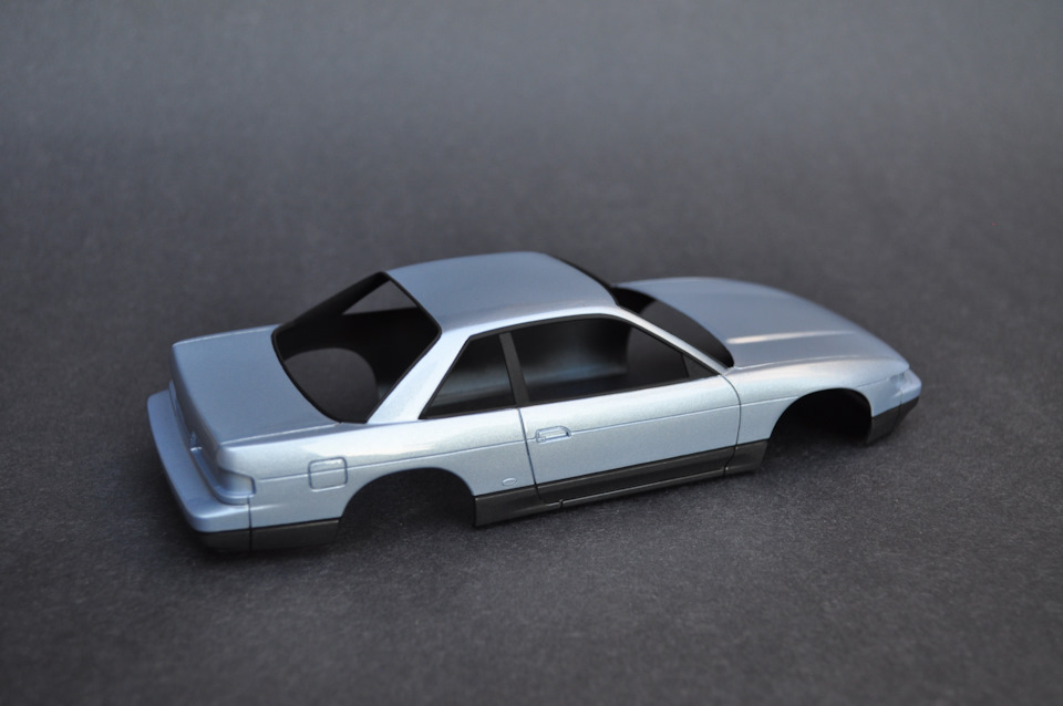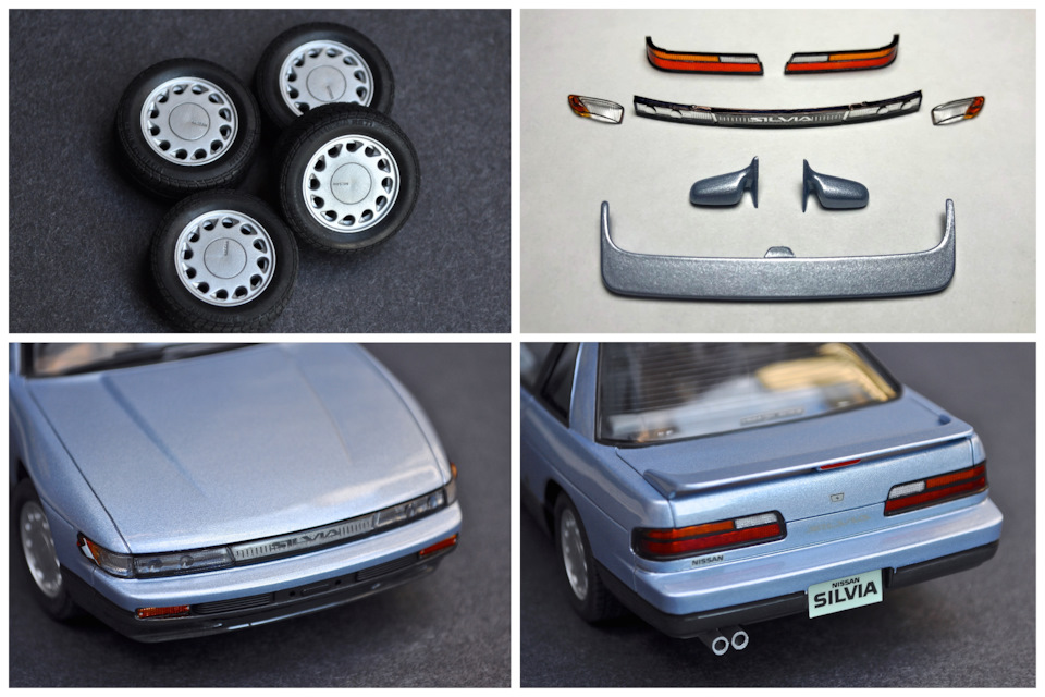 У Сильвии довольно сложная оптика, и Тамия не потрудилась сделать её отдельными деталями. Покраска надписи SILVIA впереди далась очень сложно, лучше было бы была просто декаль. Но в итоге получилось хорошо. Далее поставил фонари, крыло, и все беджи сзади. Серебряная надпись Силвия конечно не видна на светлом кузове. Фары, дворники, зеркала спереди, собрал и оттонировал колеса.