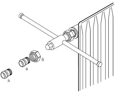 5. Снять хвостовик (а) с клапана и, с надетой на него накидной гайкой (б), вкрутить в пробку отопительного прибора, предварительно уплотнив
