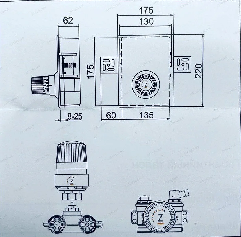 Комплектация: короб скрытого монтажа, декоративная крышка (лицевая панель), крепежные планки, латунный термостатический клапан, кран маевского для спуска воды, термостатическая головка K, термостатическая головка RTL , крепежные винты