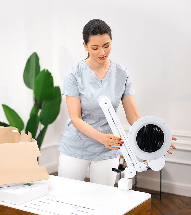 Она обеспечит положение рук клиента выше и это позволит вам выравнять осанку (работа с настольными пылесосами и встроенными вытяжками заставляет держать руки «в стол» и низко наклоняться, чтобы контролировать тонкую работу; так формируется привычка и это дополнительная нагрузка на спину, тем более, если работать в таком положении длительное время).