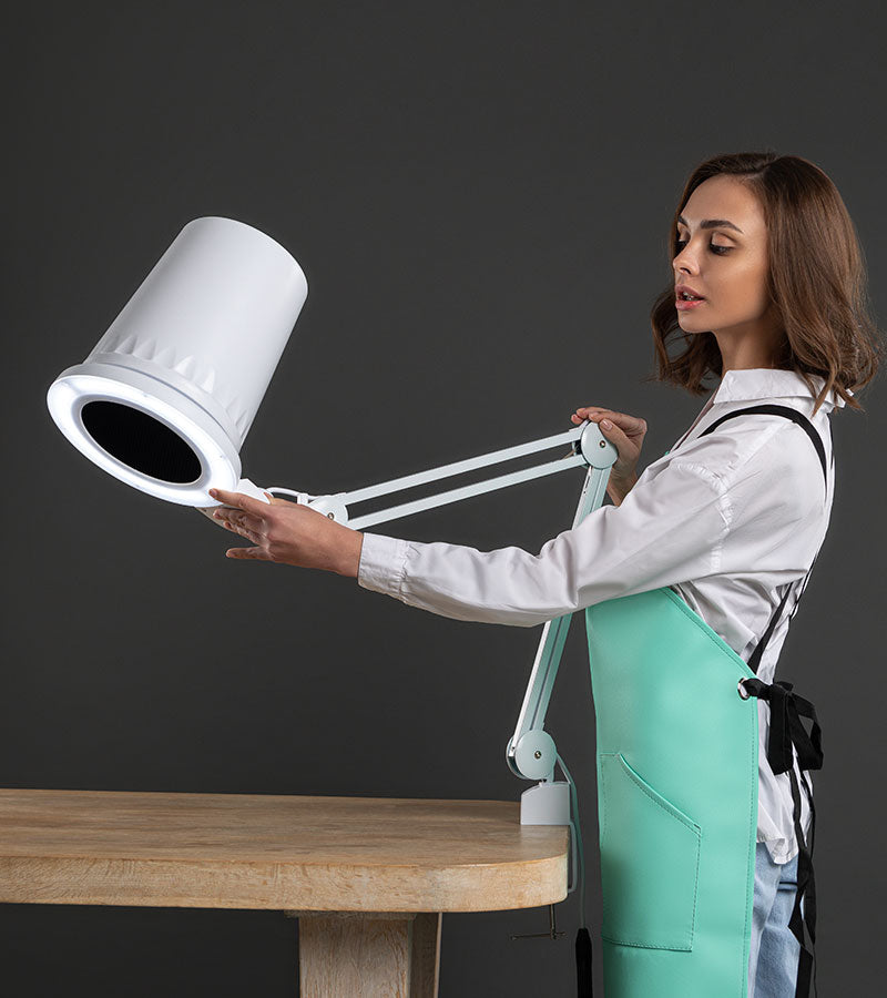 В вытяжке предусмотрен крепеж на стол/столешницу в комплекте. Устанавливая крепление на педикюрную тумбу или тележку, убедитесь в её устойчивости.