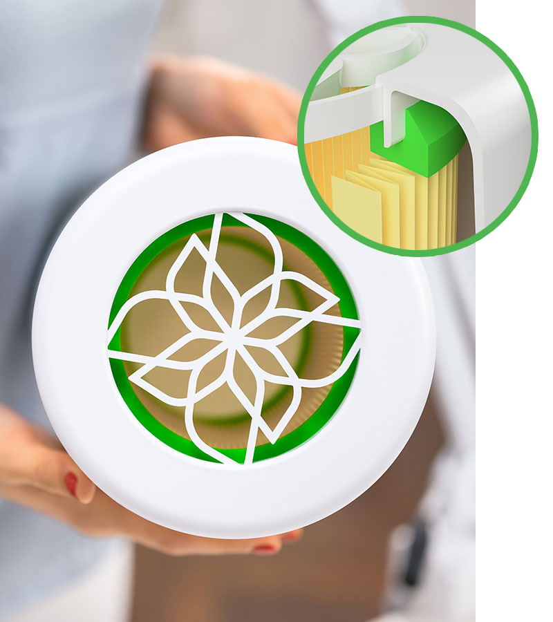 Фильтр установлен верно, если корпус вытяжки плотно закручен, а в верхнем отверстии-цветочке видна внутренняя часть фильтра (см. изображение).