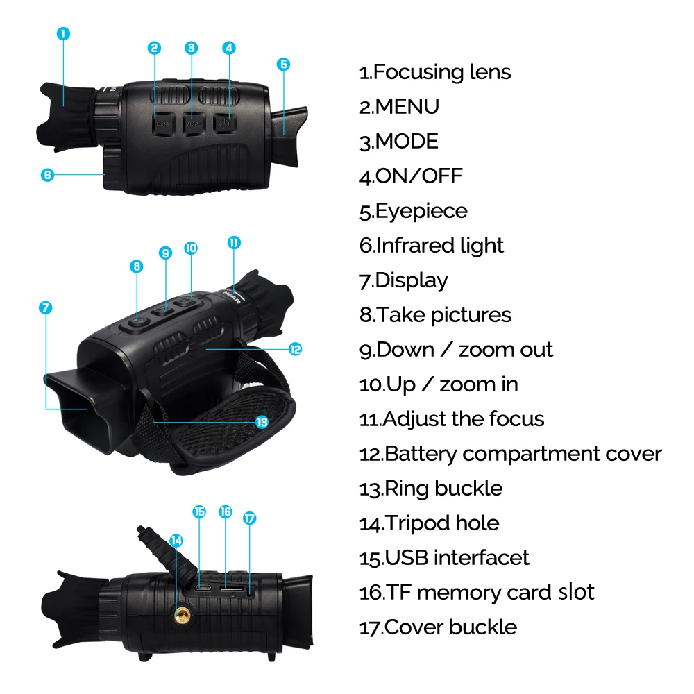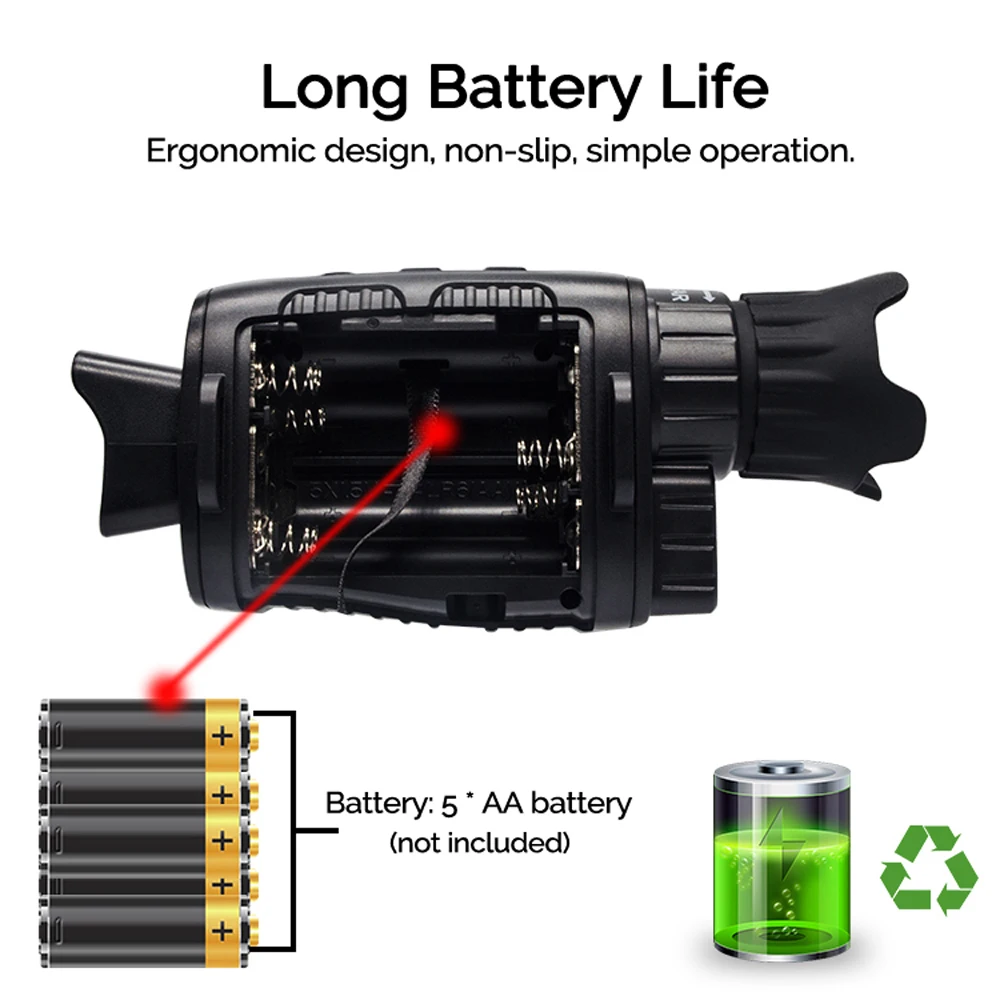 Это цифровое ночное устройство предназначено как для дневного, так и для ночного использования. Он имеет функции фото, видео и воспроизведения. 5X цифровой зум позволяет четко просматривать объекты. С помощью специального инфракрасного осветителя пользователь может видеть дальнюю цель в полной темноте от 164 ярдов до 1093 ярдов. Он идеально используется для кемпинга, пеших прогулок, спелекания, наблюдения за животными и других ночных мероприятий.Особенности:Обеспечивает Четкий просмотр До 5X цифрового зума, позволяя увеличить или уменьшить масштаб.Цель 25 мм обеспечивает кристально чистый обзор.1,5 «просматривать экран для монокуляр, которая имеет фото, видео, воспроизведения и меню функций.Цифровой бинокль ночного видения для ежедневного и ночного использования.Встроенный 850нм осветитель позволяет видеть в темноте от 164 ярдов до 1093 ярдов.0-7 уровней регулировки ИК-светильник в зависимости от мощности аккумулятора.Резьбовое крепление штатива для крепления к штативу (не входит в комплект).Простота в использовании с 5 батареями AA (не входят в комплект).Удобный и удобный ремешок для переноски.Подходит для кемпинга, рыбалки, наблюдения за птицами, кемпинга, прогулок, ночной рыбалки и катания на лодках и т. д.Характеристики:Размер изображения: 10 м/8 м/5 м/3 м/VGAРазмер видео: 2048*1440P @ 2K P30 ; 1080P @ P30 ; 1088*1088P @ P30Цифровой зум: 5XДлина ИК-волны: 850 нмЖК-дисплей Экран: 1,5″Объектив: 25 ммДиафрагма: F1.2 f = 25 ммПоле зрения: 10 °Объем памяти: макс. 512 ГБ TF карта (не входит в комплект)Питание: 5 * батарейки типа АА (не входят в комплект)Полное темное расстояние: 150 — 1000 м/164 — 1093 ярдовРабочая температура: от-20 ℃ до 60 ℃Температура хранения: от-30 ℃ до 70 ℃Размер: 158*45*65 мм/6,2*1,8*2,6 дюймовВес: прибл. 270 г/9,5 унцийВес посылка: прибл. 282g/9,9 ozПосылка:1 * монокуляр ночного видения1 * зарядный кабель Type-C1 * Руководство пользователя