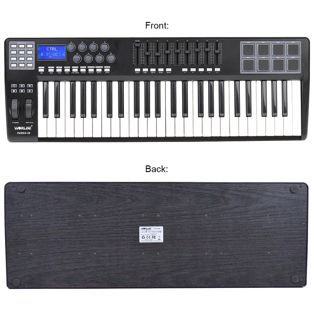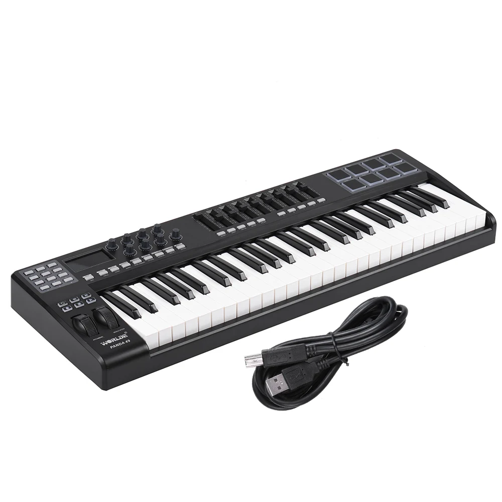 Особенности:Контроллер клавиатуры USB MIDI с 49 подходящими кнопками, чувствительными к скорости, 1 мастер слайдер громкости и 8 распределяемых слайдеров.8 распределяемые триггерные подушки с цветной RGB подсветкой в рабочем состоянии, удобные и точные.8 распределяемых ручек, программируемых и бесконечно вращающихся на 360 °; 8 кнопок управления, каждая кнопка может поддерживать две функции с помощью клавиши shift.6 кнопок для MMC и 10 кнопок ввода данных; Pitchbend и модуляционные колеса могут быть назначены как 135 контроллеров.С 2 назначенными педалями (A & B) интерфейсами и MIDI вход/выход; Питание от USB 2,0, подключи и работай, нет необходимости установки драйвера.Совместим с Win 10/ Win 8/ Win 7/ XP/ Vista/ MAC OSX; Совместим с CAKEWALK, FL Studio, Pro Tools, Ableton Live, Logic Pro, CUBASE, Studio One, ученик фортепиано, Lgrand Piano, музыкальная студия и другое основное музыкальное программное обеспечение или приложение.Характеристики:Цвет: черныйМатериал: пластикИсточник питания: адаптер питания постоянного тока 9 В (не входит в комплект) или usb-кабель (входит в комплект)Операционная система: поддержка Win 10/ Win 8/ Win 7/ XP/ Vista/ MAC OSXРазмер изделия: 76,5*26,5*6 см/30,1*10,4 * 2.4inТовар Вес: 3,5 кг/7.7lbПосылка Размеры: 82,5*30,5*11 см/32,5*12 * 4.3inПосылка Вес: 4,57 кг/10.1lbПримечание:Адаптер питания не входит в комплект.Посылка:1 * Контроллер MIDI клавиатуры1 * USB кабель