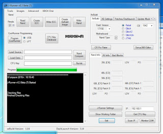 Подключаем программатор JRuner к компьютеру а плату Xbox 360 к его блоку питания и в сеть. Запускаем программу JRuner для считывания флеш памяти , микросхемы NAND. Нажимаем кнопку Read Nand , если все подключено и припаяно правильно , начнется процесс считывания флеш-памяти, процесс считывания будет выполнен дважды по умолчанию и займет в среднем пять минут.