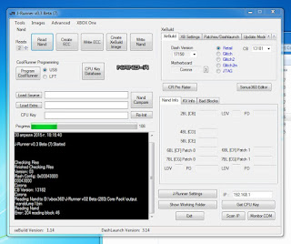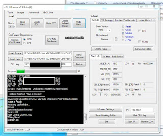 Подключаем программатор JRuner к компьютеру а плату Xbox 360 к его блоку питания и в сеть. Запускаем программу JRuner для считывания флеш памяти , микросхемы NAND. Нажимаем кнопку Read Nand , если все подключено и припаяно правильно , начнется процесс считывания флеш-памяти, процесс считывания будет выполнен дважды по умолчанию и займет в среднем пять минут.