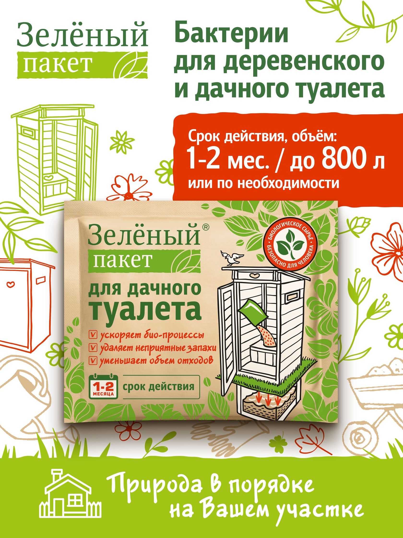 Зеленый пакет для дачного туалета – это очень простое в применении средство. Содержимого пакета следует высыпать в септик, туалет или выгребную яму. Чтобы ускорить процесс активации бактерий и обеспечить более высокую скорость раскладывания фекальных масс поверх бактерий можно налить воду.