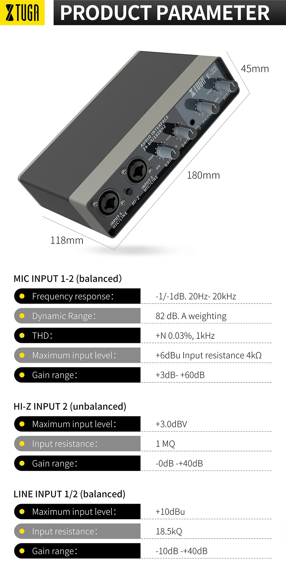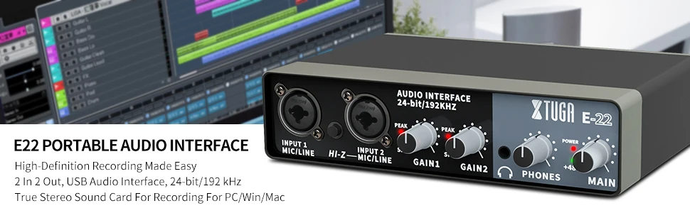 【 24 бит/192 кГц Профессиональное аудио Quality】 XTUGA E-22 аудио интерфейс, со всеми интерфейсами подключения для микрофона, электрогитары, басов и т. Д. В комплект входит фантомный блок питания a + 48 В для конденсаторных микрофонов и HI-Z усилитель микрофона; Аудиоинтерфейс E-22 оснащен преобразователем 24 бит/192 кГц для обеспечения оптимального качества звука. Независимо от того, являетесь ли вы певицей, songwriter, продюсером на ходу или вам необходимо сопровождать во время записи, ультра-надежный E-22 аудиоинтерфейс поможет вам сиять в цифровой области.